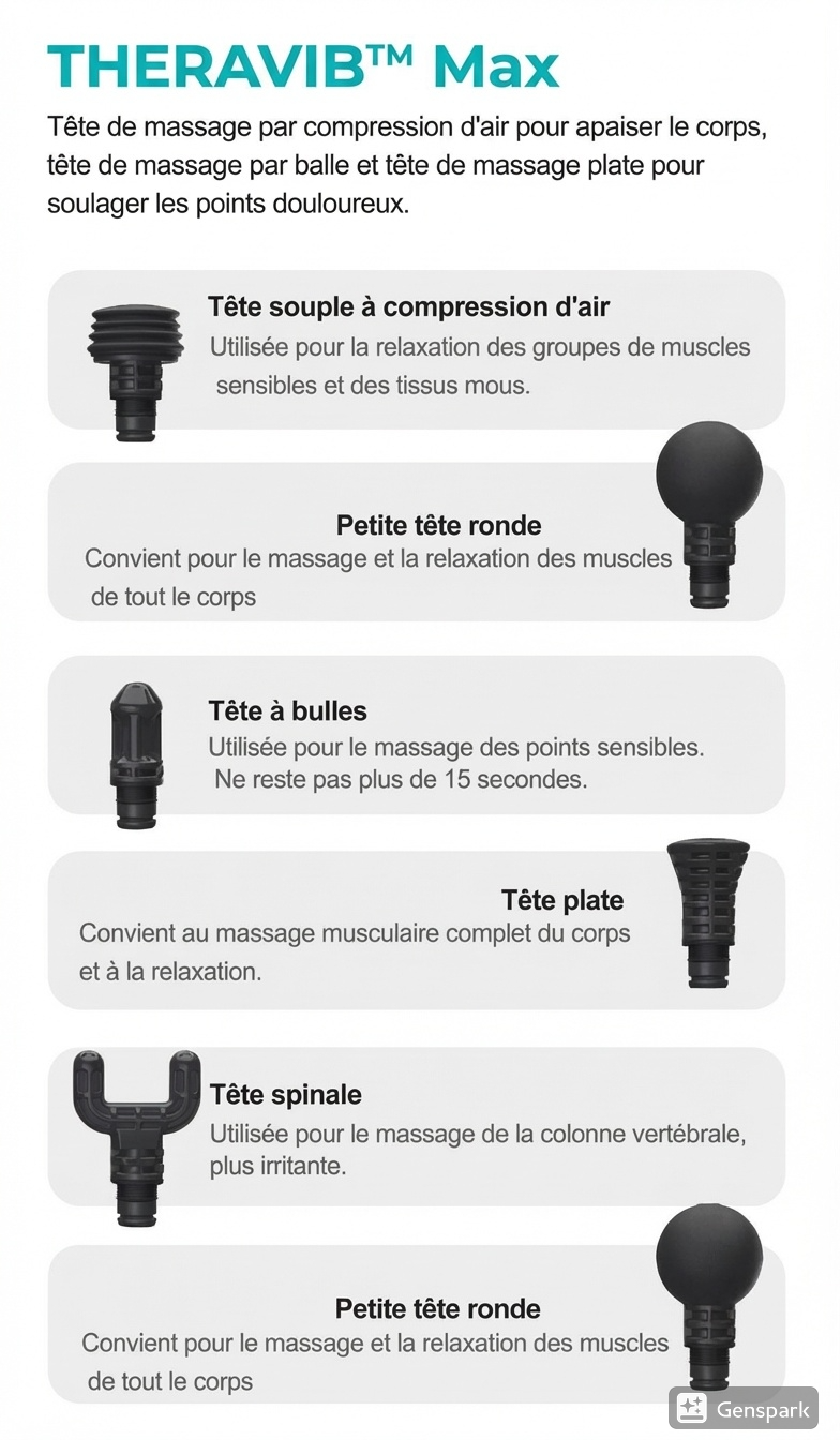 - 8 têtes de massage professionnelles : Sphère (x2), Fourche, Bulle, U, Plat, Épine, Cône.