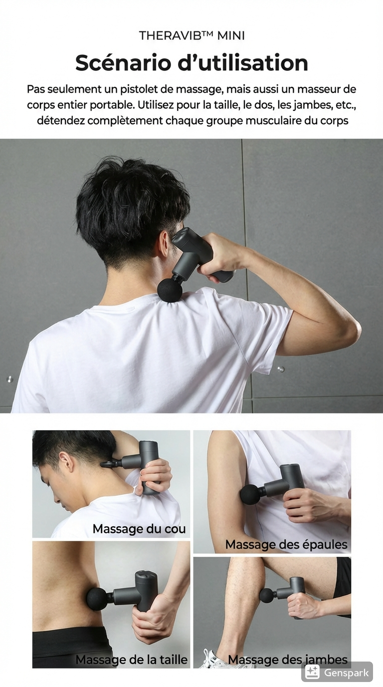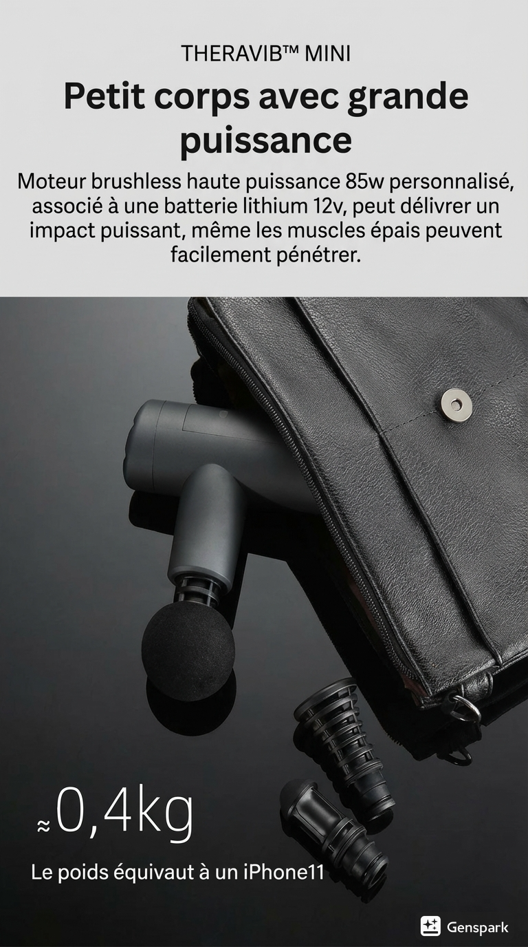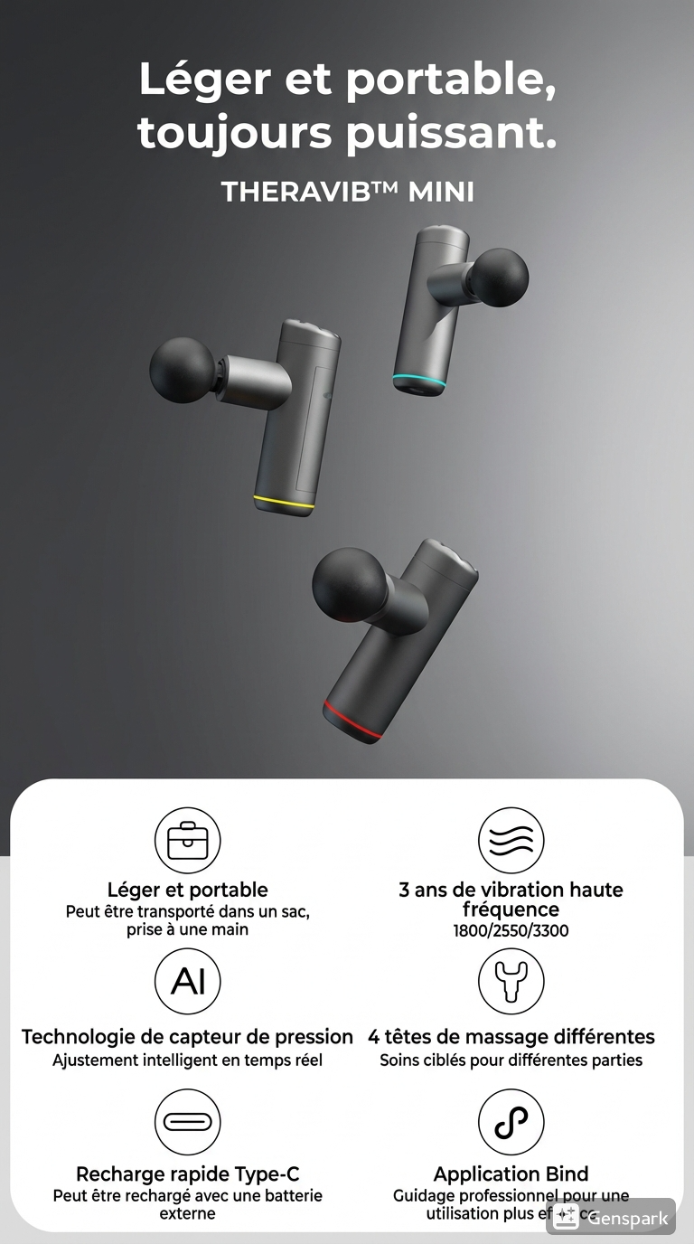 Conçu pour le sportif nomade, le voyageur d'affaires, l'étudiant en déplacement ou simplement celui qui veut un outil efficace sans l'encombrement. Le Mini prouve que la performance Theravib n'a pas de frontières. Emmenez votre récupération avec vous, où que vous alliez.