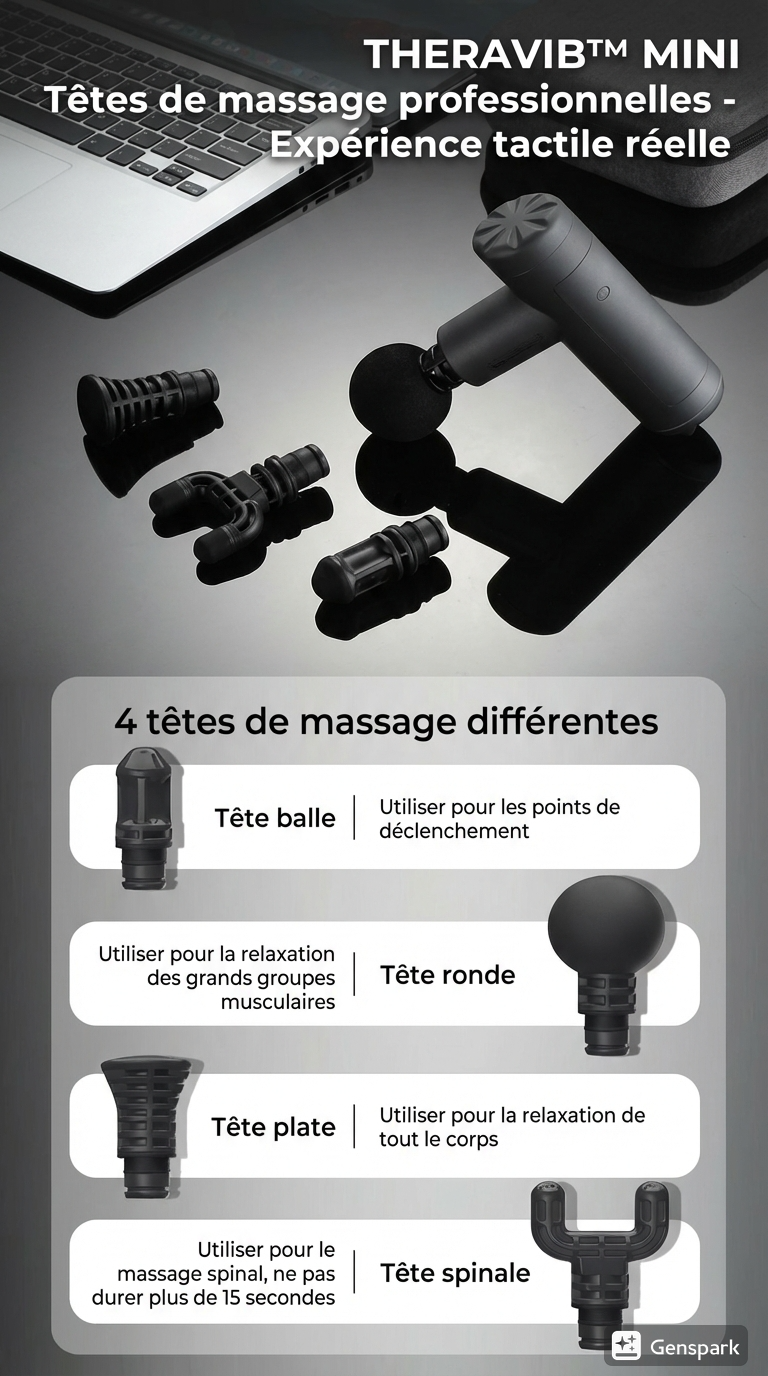 - 4 têtes de massage polyvalentes : Sphère, Fourche, U, Plat.
